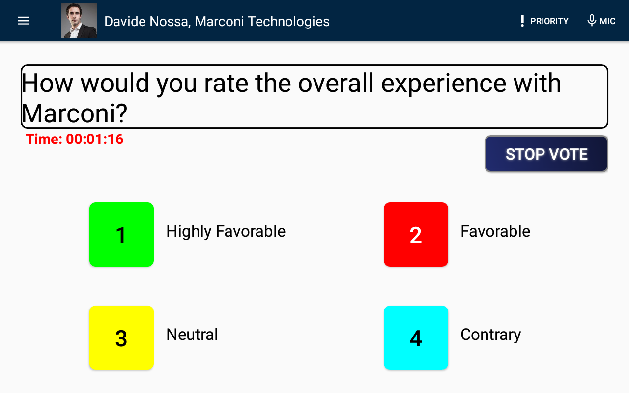 Highly flexible and customizable Voting & Survey module made for MODE based solutions allowing the possibility to run voting sessions or any kind of survey desired. The software is installed together with MD-CM Conference Management module and it’s perfectly integrated with all the components: role permission customization (decide who can control the vote start and stop, the creation and the duration), synoptic integration to have a comfortable view of the on-going voting option on external displays without the need of an additional software component. The software is OS independent meaning that any device authorized in the MODE network can have access to the voting participation and management. Wireless, wired units in the same MODE based network can now vote and participate to surveys!